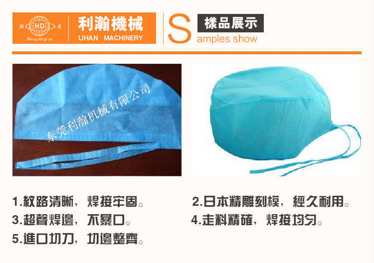 全主動超聲波制帽機,是利瀚企業 全主動制帽設備,運用超聲波技能將不織布經過機電一體化主動操控,制作成醫用手術帽、廚師帽等產品;本機主動化程度較高,一人克操作多臺設備,功率可達60---90cps/min。可生產18、19、21及24寸頭套
