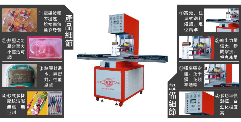 “鴻達(dá)”牌5-15KW單頭推盤式高周波熔接機(jī)是我司為提高環(huán)保理念而設(shè)計出的新產(chǎn)品高周波(高頻機(jī))塑膠熔接機(jī)(又名高周波塑膠熔接機(jī)),它是利用高頻電場使塑料內(nèi)部份子振蕩產(chǎn)生熱能而進(jìn)行各類制品熔合是塑料熱合的設(shè)備,周率穩(wěn)定。本機(jī)振蕩周率采用國際工業(yè)波段13.56MHZ或27.12MHz,輸出周率穩(wěn)定,符合國際標(biāo)準(zhǔn),適合各地使用。高頻熱合機(jī)在工作或靜止時,無論是突然遇到停電還是停氣時,或者是通電還是通氣時,機(jī)器都是靜止?fàn)顟B(tài),保持原來位置,不會突然上升或下降;大大提高工人操作安全問題。低損耗同軸振蕩器,同調(diào)調(diào)諧器,高頻熱合機(jī)輸出力強(qiáng)縮短熔接時間,提高產(chǎn)量。