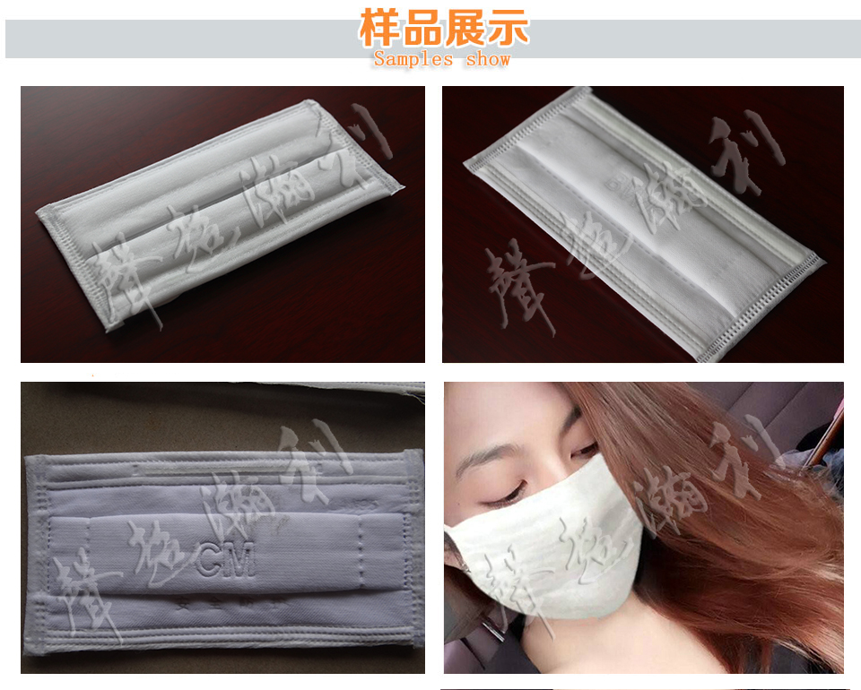 1、本機臺是生產口罩成品的機臺。從生產口罩本體---熔接鼻梁條---包邊----壓紋---切片,全自動化,一人可操作多臺設備