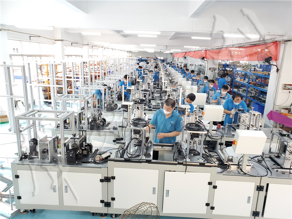 9.整條生產線由2個人操作,一個人負責看機運轉以及更換原材料卷料;一個人負責收集成品口罩有序排列裝箱;負責看機的人可以同時兼顧多臺機器。